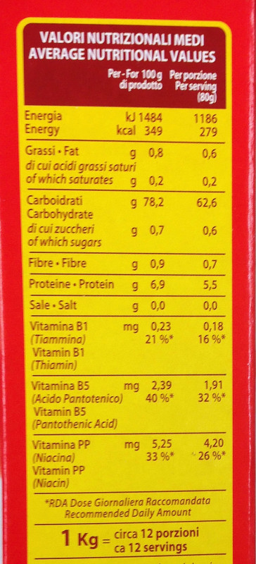 Barcode EAN:   8001420004229 Energy kcal/100g:   349 Satured Fat (per 100g)g:   0.2 Sugar into Carbohydrates (per 100g)g:   0.7 Proteines (per 100g)g:   6.9 Calcium CA/ mg (per 100g)g:   Gluten:   Made in:   Italy Bought here:   Last update:   2017-02-28 19:08:39 | Brand:   Fat (per 100g)g:   0.8 Carbohydrates (per 100g)g:   78.2 Fiber (per 100g)g:   0.9 Salt - Sodium (per 100g)g:   0.23 Ingredients (Indicative):   Production type:   Price €:   Cooking time - min.:   8 |