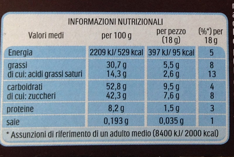 Barcode EAN:   8000500205167 Energy kcal/100g:   529 Satured Fat (per 100g)g:   14.3 Sugar into Carbohydrates (per 100g)g:   42.3 Proteines (per 100g)g:   8.2 Calcium CA/ mg (per 100g)g:   Gluten:   Production type:   Made in:   Italy Price €:   Bought here:   Last update:   2017-03-01 17:50:10 | Brand:   Fat (per 100g)g:   30.7 Carbohydrates (per 100g)g:   52.8 Fiber (per 100g)g:   Salt - Sodium (per 100g)g:   0.193 Ingredients (Indicative):   |