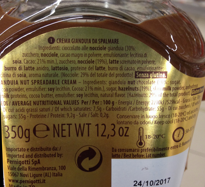 Barcode EAN:   8001675506042 Energy kcal/100g:   529 Satured Fat (per 100g)g:   7.5 Sugar into Carbohydrates (per 100g)g:   55 Proteines (per 100g)g:   9.2 Calcium CA/ mg (per 100g)g:   Gluten:   Production type:   Made in:   Italy Price €:   Bought here:   Last update:   2017-03-01 18:47:15 | Brand:   Fat (per 100g)g:   30 Carbohydrates (per 100g)g:   55 Fiber (per 100g)g:   Salt - Sodium (per 100g)g:   0.2 Ingredients (Indicative):   |