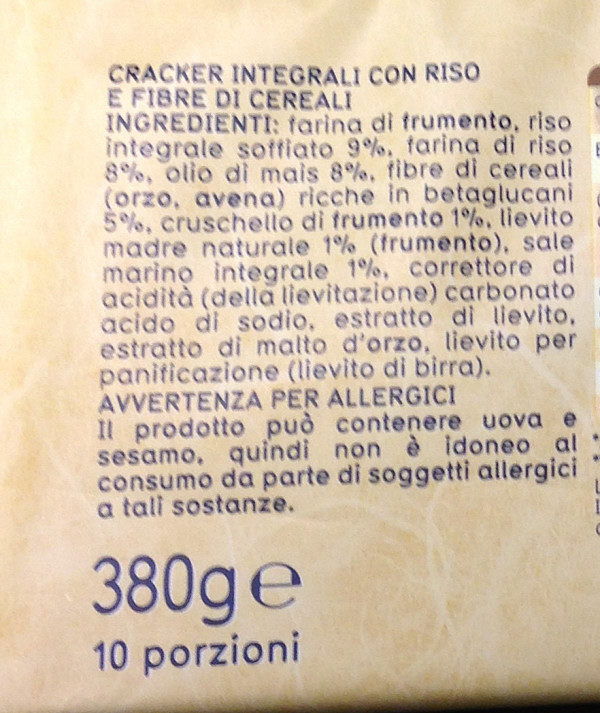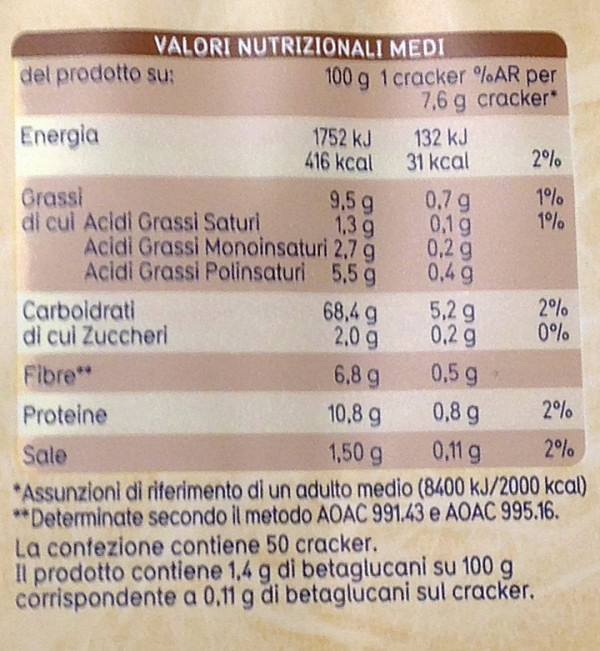 Barcode EAN:   8002190002651 Energy kcal/100g:   416 Satured Fat (per 100g)g:   1.3 Sugar into Carbohydrates (per 100g)g:   2 Proteines (per 100g)g:   10.8 Calcium CA/ mg (per 100g)g:   Gluten:   Production type:   Made in:   Italy Price €:   Bought here:   Last update:   2017-03-04 16:50:42 | Brand:   Fat (per 100g)g:   9.5 Carbohydrates (per 100g)g:   68.4 Fiber (per 100g)g:   6.8 Salt - Sodium (per 100g)g:   1.5 Ingredients (Indicative):   |