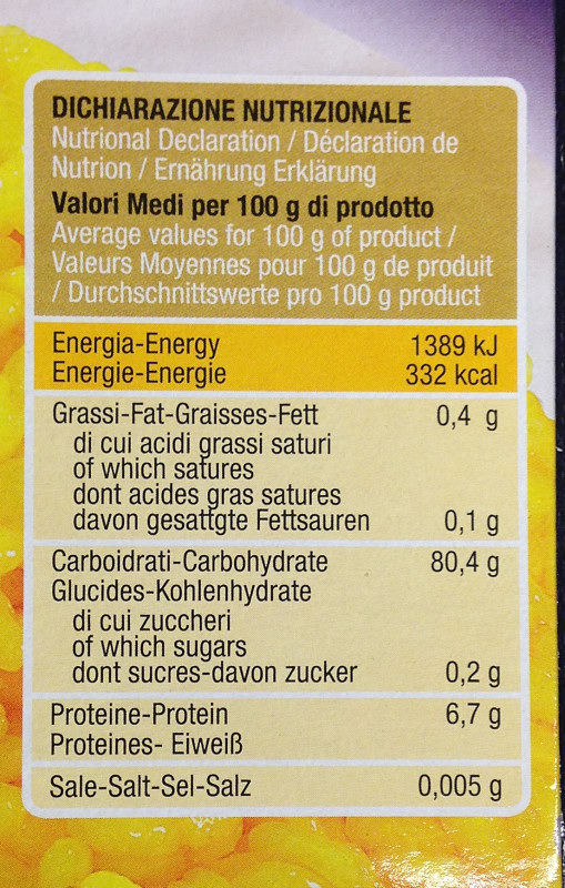 Barcode EAN:   8027839030291 Energy kcal/100g:   332 Satured Fat (per 100g)g:   0.1 Sugar into Carbohydrates (per 100g)g:   0.2 Proteines (per 100g)g:   6.7 Calcium CA/ mg (per 100g)g:   Gluten:   Made in:   Italy Bought here:   Last update:   2017-03-04 18:37:56 | Brand:   Fat (per 100g)g:   0.4 Carbohydrates (per 100g)g:   80.4 Fiber (per 100g)g:   Salt - Sodium (per 100g)g:   0.005 Ingredients (Indicative):   Production type:   Price €:   Cooking time - min.:   18 |
