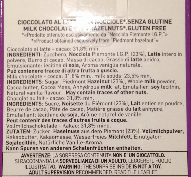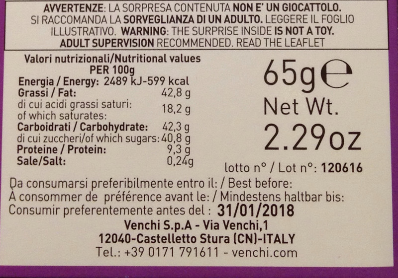 Barcode EAN:   8002996070809 Energy kcal/100g:   599 Satured Fat (per 100g)g:   18.2 Sugar into Carbohydrates (per 100g)g:   40.8 Proteines (per 100g)g:   9.3 Calcium CA/ mg (per 100g)g:   Gluten:   Production type:   Made in:   Italy Price €:   Bought here:   Last update:   2017-03-05 16:38:46 | Brand:   Fat (per 100g)g:   42.8 Carbohydrates (per 100g)g:   42.3 Fiber (per 100g)g:   Salt - Sodium (per 100g)g:   0.24 Ingredients (Indicative):   |