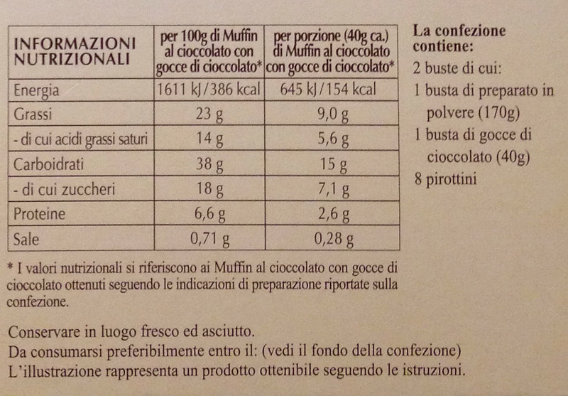 Barcode EAN:   8003340030609 Energy kcal/100g:   386 Satured Fat (per 100g)g:   14 Sugar into Carbohydrates (per 100g)g:   18 Proteines (per 100g)g:   6.6 Calcium CA/ mg (per 100g)g:   Gluten:   Production type:   Made in:   Italy Price €:   Bought here:   Last update:   2017-03-05 17:20:17 | Brand:   Fat (per 100g)g:   23 Carbohydrates (per 100g)g:   38 Fiber (per 100g)g:   Salt - Sodium (per 100g)g:   0.71 Ingredients (Indicative):   |