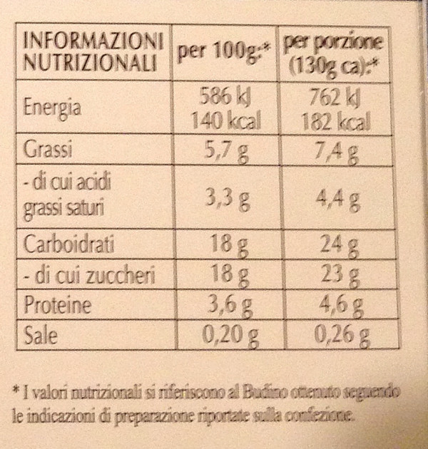Barcode EAN:   8003340038841 Energy kcal/100g:   140 Satured Fat (per 100g)g:   3.3 Sugar into Carbohydrates (per 100g)g:   18 Proteines (per 100g)g:   3.6 Calcium CA/ mg (per 100g)g:   Gluten:   Production type:   Made in:   Italy Price €:   Bought here:   Last update:   2017-03-05 17:54:49 | Brand:   Fat (per 100g)g:   5.7 Carbohydrates (per 100g)g:   18 Fiber (per 100g)g:   Salt - Sodium (per 100g)g:   0.2 Ingredients (Indicative):   |