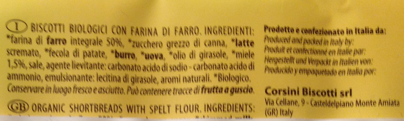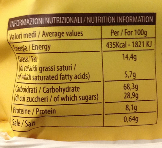 Barcode EAN:   8001667005577 Energy kcal/100g:   435 Satured Fat (per 100g)g:   5.7 Sugar into Carbohydrates (per 100g)g:   28.9 Proteines (per 100g)g:   8.1 Calcium CA/ mg (per 100g)g:   Gluten:   Production type:   Made in:   Italy Price €:   Bought here:   Last update:   2017-03-06 19:34:50 | Brand:   Fat (per 100g)g:   14.4 Carbohydrates (per 100g)g:   68.3 Fiber (per 100g)g:   Salt - Sodium (per 100g)g:   0.64 Ingredients (Indicative):   |