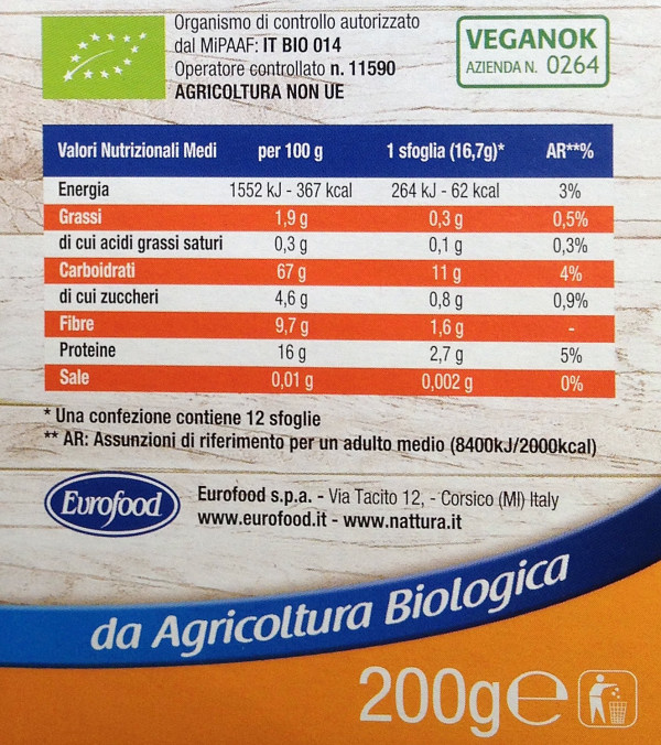Barcode EAN:   8000003048315 Energy kcal/100g:   367 Satured Fat (per 100g)g:   0.3 Sugar into Carbohydrates (per 100g)g:   4.6 Proteines (per 100g)g:   16 Calcium CA/ mg (per 100g)g:   Gluten:   Production type:   Made in:   Italy Bought here:   Last update:   2017-03-10 19:53:57 | Brand:   Fat (per 100g)g:   1.9 Carbohydrates (per 100g)g:   67 Fiber (per 100g)g:   9.7 Salt - Sodium (per 100g)g:   0.01 Ingredients (Indicative):   Price €:   |