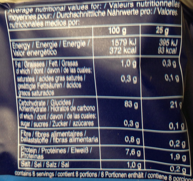 Barcode EAN:   8001860355004 Energy kcal/100g:   372 Satured Fat (per 100g)g:   0.3 Sugar into Carbohydrates (per 100g)g:   0.3 Proteines (per 100g)g:   7.6 Calcium CA/ mg (per 100g)g:   Gluten:   Production type:   Made in:   Italy Bought here:   Last update:   2017-03-11 08:56:47 | Brand:   Fat (per 100g)g:   1 Carbohydrates (per 100g)g:   83 Fiber (per 100g)g:   0.8 Salt - Sodium (per 100g)g:   1 Ingredients (Indicative):   Price €:   |