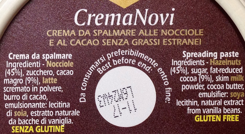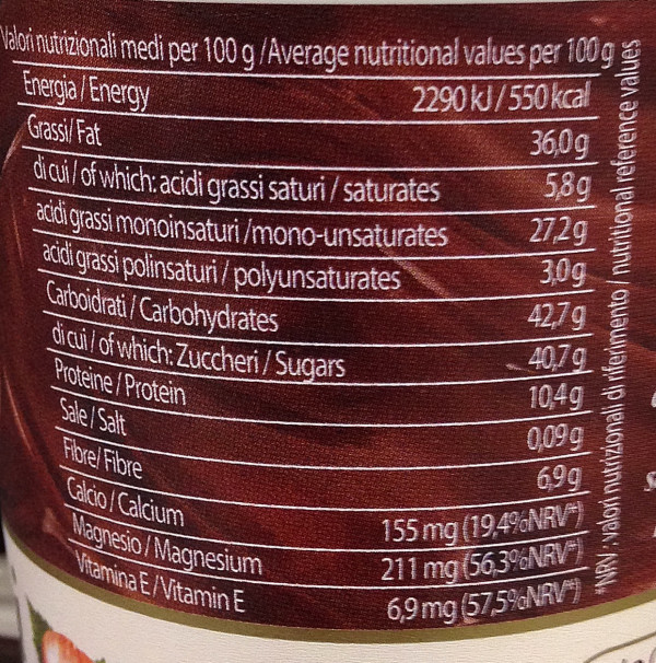 Barcode EAN:   8006380886007 Energy kcal/100g:   550 Satured Fat (per 100g)g:   5.8 Sugar into Carbohydrates (per 100g)g:   40.7 Proteines (per 100g)g:   10.4 Calcium CA/ mg (per 100g)g:   Gluten:   Production type:   Made in:   Italy Price €:   Bought here:   Last update:   2017-03-11 16:43:12 | Brand:   Fat (per 100g)g:   36 Carbohydrates (per 100g)g:   42.7 Fiber (per 100g)g:   6.9 Salt - Sodium (per 100g)g:   0.09 Ingredients (Indicative):   |