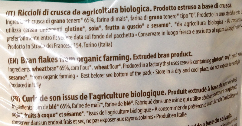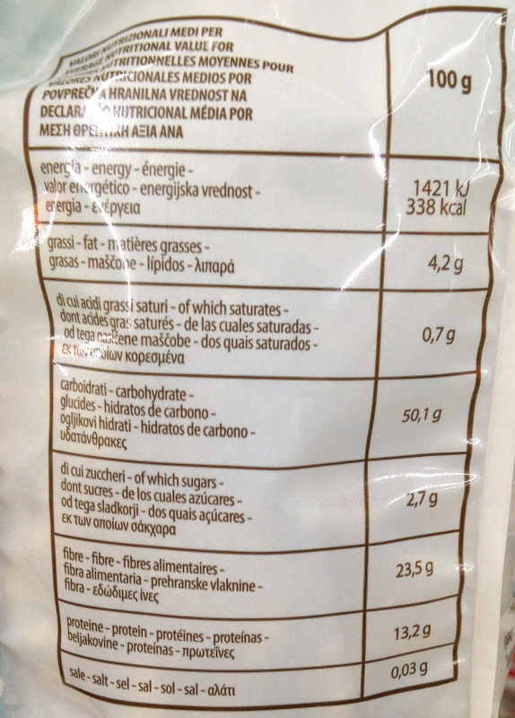 Barcode EAN:   8002885003604 Energy kcal/100g:   338 Satured Fat (per 100g)g:   0.7 Sugar into Carbohydrates (per 100g)g:   2.7 Proteines (per 100g)g:   13.2 Calcium CA/ mg (per 100g)g:   Gluten:   Production type:   Made in:   Italy Price €:   Last update:   2017-03-12 11:21:51 | Brand:   Fat (per 100g)g:   4.2 Carbohydrates (per 100g)g:   50.1 Fiber (per 100g)g:   23.5 Salt - Sodium (per 100g)g:   0.03 Ingredients (Indicative):   Bought here:   |