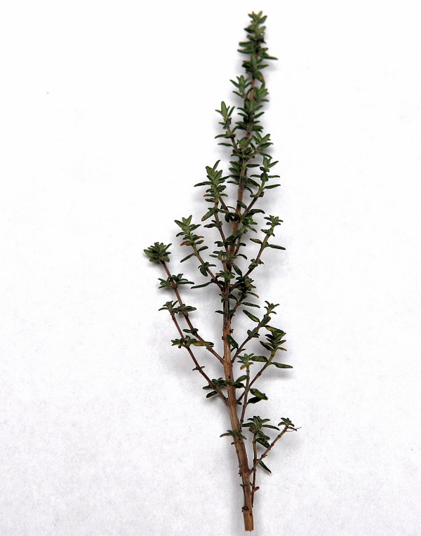 Thyme (Thymus vulgaris, family Lamiaceae) is one of the most characteristic Mediterranean culinary herbs. It is a small, woody, evergreen subshrub with many branched stems and tiny oval to lanceolate grey-green leaves. Small white to pink flowers appear in late spring–summer and are highly attractive to pollinators. The aroma is strong, balsamic, herbal and slightly pungent, due to a high content of essential oils. Fresh and dried thyme are widely used in home cooking, the food industry, herbal products and cosmetics.