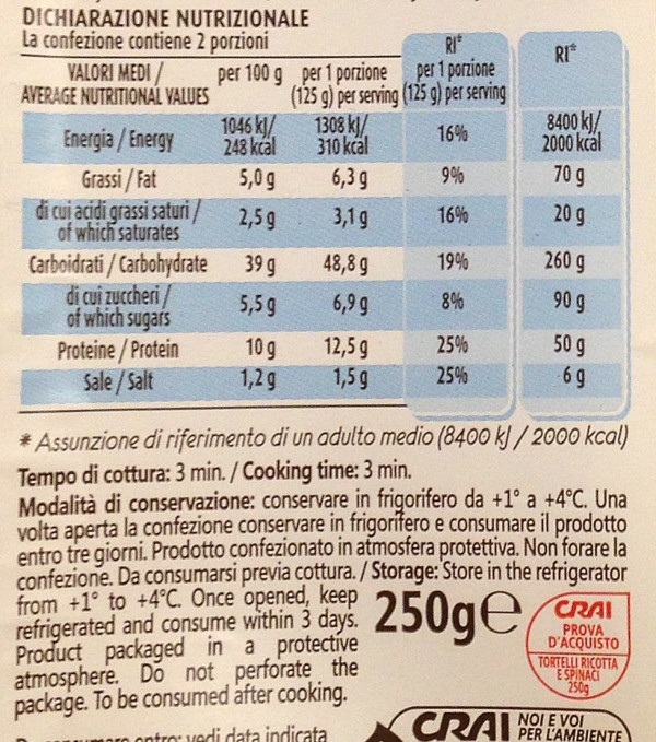 Barcode EAN:   8002895001454 Energy kcal/100g:   248 Satured Fat (per 100g)g:   2.5 Sugar into Carbohydrates (per 100g)g:   5.5 Proteines (per 100g)g:   10 Calcium CA/ mg (per 100g)g:   Gluten:   Production type:   Made in:   Italy Price €:   Bought here:   Last update:   2017-03-13 18:04:15 | Brand:   Fat (per 100g)g:   5 Carbohydrates (per 100g)g:   39 Fiber (per 100g)g:   Salt - Sodium (per 100g)g:   1.2 Ingredients (Indicative):   |