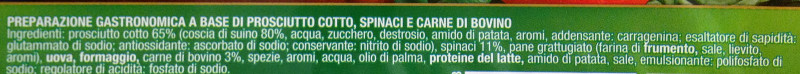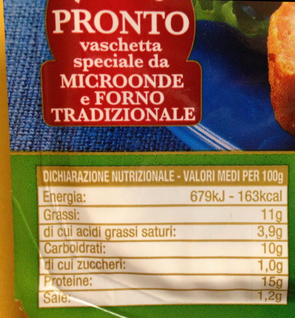 Barcode EAN:   8007141106532 Energy kcal/100g:   163 Satured Fat (per 100g)g:   3.9 Sugar into Carbohydrates (per 100g)g:   1 Proteines (per 100g)g:   16 Calcium CA/ mg (per 100g)g:   Gluten:   Production type:   Made in:   Italy Price €:   Bought here:   Last update:   2017-03-13 19:59:52 | Brand:   Fat (per 100g)g:   11 Carbohydrates (per 100g)g:   10 Fiber (per 100g)g:   Salt - Sodium (per 100g)g:   1.2 Ingredients (Indicative):   |