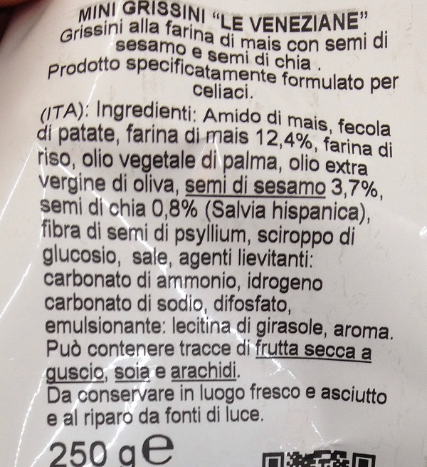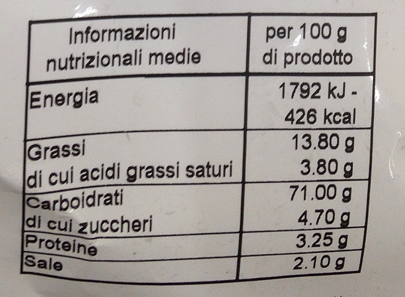 Barcode EAN:   8009915008912 Energy kcal/100g:   426 Satured Fat (per 100g)g:   3.8 Sugar into Carbohydrates (per 100g)g:   4.7 Proteines (per 100g)g:   3.25 Calcium CA/ mg (per 100g)g:   Gluten:   Production type:   Made in:   Italy Price €:   Bought here:   Last update:   2017-03-17 18:58:32 | Brand:   Fat (per 100g)g:   13.8 Carbohydrates (per 100g)g:   71 Fiber (per 100g)g:   Salt - Sodium (per 100g)g:   2.1 Ingredients (Indicative):   |