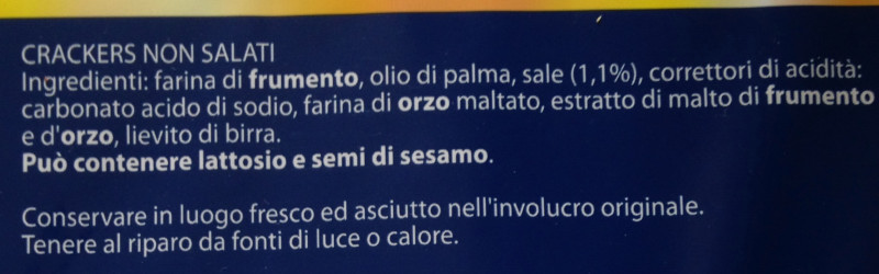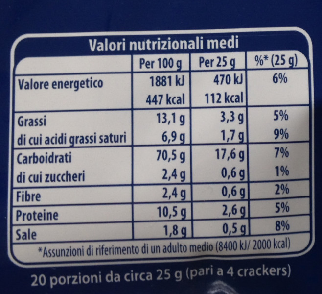 Barcode EAN:   8008910807384 Energy kcal/100g:   447 Satured Fat (per 100g)g:   6.9 Sugar into Carbohydrates (per 100g)g:   2.4 Proteines (per 100g)g:   10.5 Calcium CA/ mg (per 100g)g:   Gluten:   Production type:   Made in:   Italy Price €:   Bought here:   Last update:   2017-03-18 07:34:52 | Brand:   Fat (per 100g)g:   13.1 Carbohydrates (per 100g)g:   70.5 Fiber (per 100g)g:   2.4 Salt - Sodium (per 100g)g:   1.8 Ingredients (Indicative):