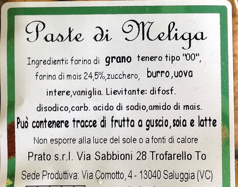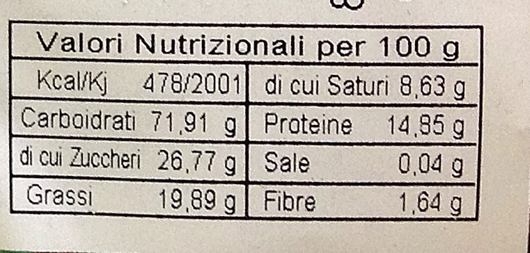 Barcode EAN:   8017716016029 Energy kcal/100g:   478 Satured Fat (per 100g)g:   8.63 Sugar into Carbohydrates (per 100g)g:   26.77 Proteines (per 100g)g:   14.85 Calcium CA/ mg (per 100g)g:   Gluten:   Production type:   Made in:   Italy Price €:   Bought here:   Last update:   2017-03-19 12:14:29 | Brand:   Fat (per 100g)g:   19.89 Carbohydrates (per 100g)g:   71.91 Fiber (per 100g)g:   1.64 Salt - Sodium (per 100g)g:   0.04 Ingredients (Indicative):   |