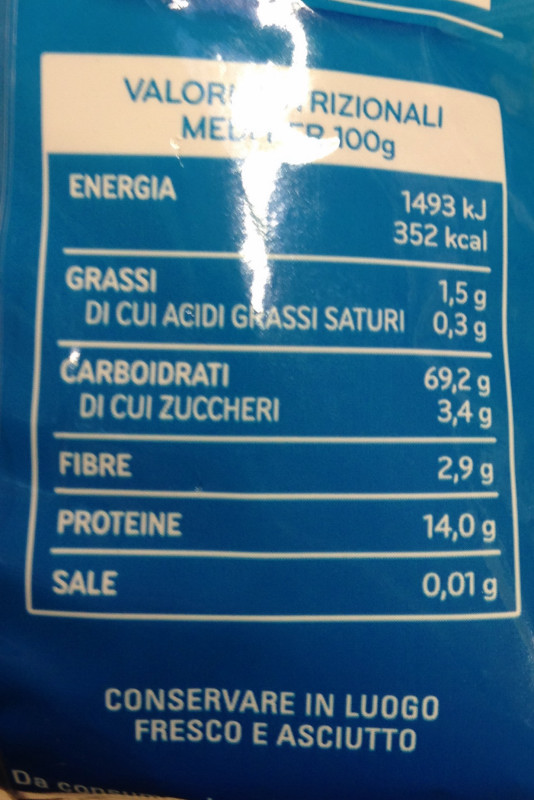 Barcode EAN:   8001250120267 Energy kcal/100g:   352 Satured Fat (per 100g)g:   0.3 Sugar into Carbohydrates (per 100g)g:   3.4 Proteines (per 100g)g:   14 Calcium CA/ mg (per 100g)g:   Gluten:   Made in:   Italy Bought here:   Last update:   2017-03-19 16:32:47 | Brand:   Fat (per 100g)g:   1.5 Carbohydrates (per 100g)g:   69.2 Fiber (per 100g)g:   2.9 Salt - Sodium (per 100g)g:   0.01 Ingredients (Indicative):   Production type:   Price €:   Cooking time - min.:   14 |