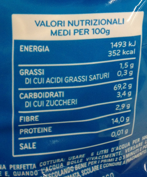 Barcode EAN:   8001250120915 Energy kcal/100g:   352 Satured Fat (per 100g)g:   0.3 Sugar into Carbohydrates (per 100g)g:   3.4 Proteines (per 100g)g:   14 Calcium CA/ mg (per 100g)g:   Gluten:   Made in:   Italy Bought here:   Last update:   2017-03-19 16:45:13 | Brand:   Fat (per 100g)g:   1.5 Carbohydrates (per 100g)g:   69.2 Fiber (per 100g)g:   2.9 Salt - Sodium (per 100g)g:   0.01 Ingredients (Indicative):   Production type:   Price €:   Cooking time - min.:   11 |