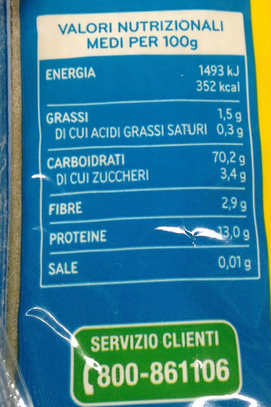 Barcode EAN:   8001250124128 Energy kcal/100g:   352 Satured Fat (per 100g)g:   0.3 Sugar into Carbohydrates (per 100g)g:   3.4 Proteines (per 100g)g:   13 Calcium CA/ mg (per 100g)g:   Gluten:   Made in:   Italy Bought here:   Last update:   2017-03-19 18:06:57 | Brand:   Fat (per 100g)g:   1.5 Carbohydrates (per 100g)g:   70.2 Fiber (per 100g)g:   2.9 Salt - Sodium (per 100g)g:   0.01 Ingredients (Indicative):   Production type:   Price €:   Cooking time - min.:   13 |
