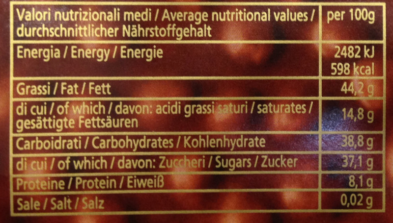 Barcode EAN:   8006380217214 Energy kcal/100g:   598 Satured Fat (per 100g)g:   14.8 Sugar into Carbohydrates (per 100g)g:   37.1 Proteines (per 100g)g:   8.1 Calcium CA/ mg (per 100g)g:   Gluten:   Production type:   Made in:   Italy Price €:   Bought here:   Last update:   2017-03-22 18:35:13 | Brand:   Fat (per 100g)g:   44.2 Carbohydrates (per 100g)g:   38.8 Fiber (per 100g)g:   Salt - Sodium (per 100g)g:   0.02 Ingredients (Indicative):   |
