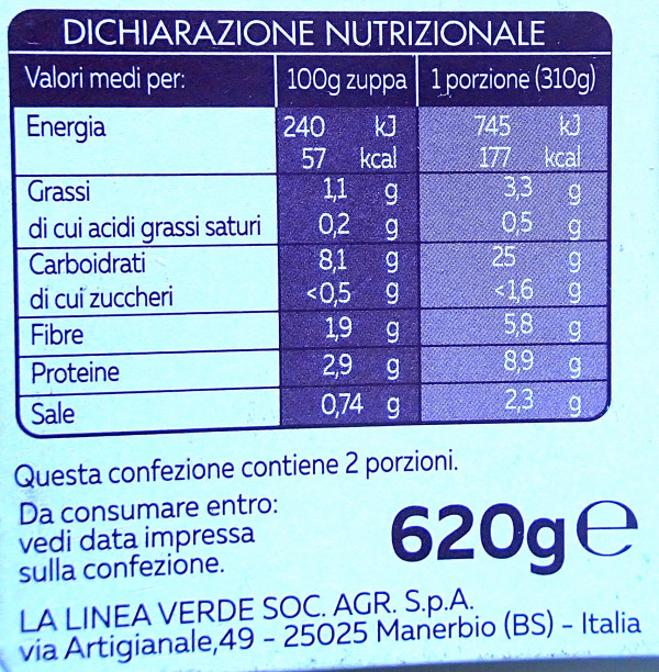 Barcode EAN:   8014190014947 Energy kcal/100g:   57 Satured Fat (per 100g)g:   0.2 Sugar into Carbohydrates (per 100g)g:   0.4 Proteines (per 100g)g:   2.9 Calcium CA/ mg (per 100g)g:   Gluten:   Production type:   Made in:   Italy Price €:   Bought here:   Last update:   2017-11-08 18:41:59 | Brand:   Fat (per 100g)g:   1.1 Carbohydrates (per 100g)g:   8.1 Fiber (per 100g)g:   1.9 Salt - Sodium (per 100g)g:   0.74 Ingredients (Indicative):   |