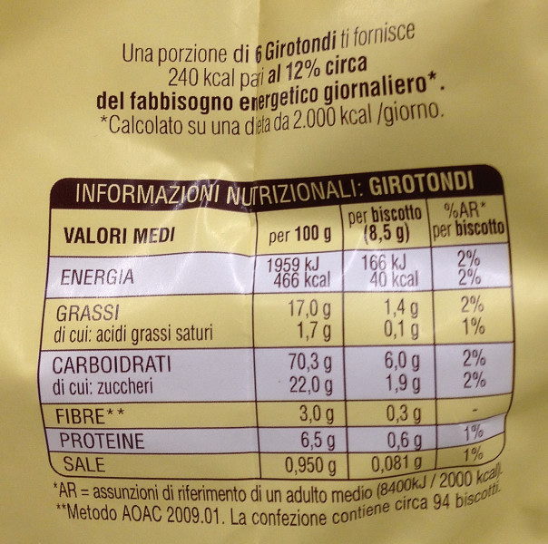 Barcode EAN:   8076809542548 Energy kcal/100g:   466 Satured Fat (per 100g)g:   1.7 Sugar into Carbohydrates (per 100g)g:   22 Proteines (per 100g)g:   6.5 Calcium CA/ mg (per 100g)g:   Gluten:   Production type:   Made in:   Italy Price €:   Bought here:   Last update:   2017-04-15 17:33:42 | Brand:   Fat (per 100g)g:   17 Carbohydrates (per 100g)g:   70.3 Fiber (per 100g)g:   3 Salt - Sodium (per 100g)g:   0.95 Ingredients (Indicative):   |