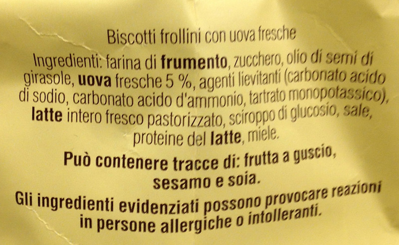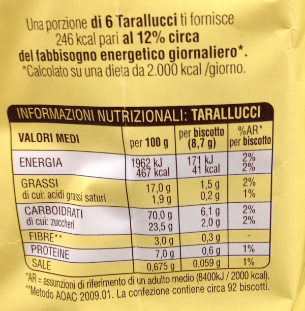 Barcode EAN:   8076809507103 Energy kcal/100g:   467 Satured Fat (per 100g)g:   1.9 Sugar into Carbohydrates (per 100g)g:   23.5 Proteines (per 100g)g:   7 Calcium CA/ mg (per 100g)g:   Gluten:   Production type:   Made in:   Italy Price €:   Bought here:   Last update:   2017-04-15 18:02:15 | Brand:   Fat (per 100g)g:   17 Carbohydrates (per 100g)g:   70 Fiber (per 100g)g:   3 Salt - Sodium (per 100g)g:   0.675 Ingredients (Indicative):   |