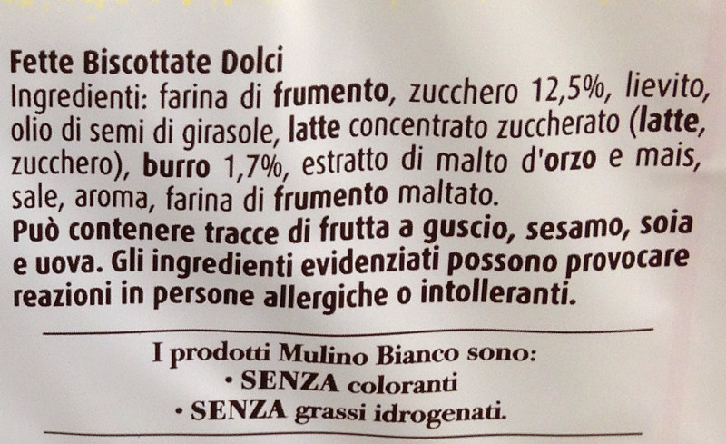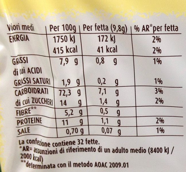 Barcode EAN:   8076809568319 Energy kcal/100g:   415 Satured Fat (per 100g)g:   1.9 Sugar into Carbohydrates (per 100g)g:   14 Proteines (per 100g)g:   11 Calcium CA/ mg (per 100g)g:   Gluten:   Production type:   Made in:   Italy Price €:   Bought here:   Last update:   2017-04-16 17:16:19 | Brand:   Fat (per 100g)g:   7.9 Carbohydrates (per 100g)g:   72.3 Fiber (per 100g)g:   5.2 Salt - Sodium (per 100g)g:   0.7 Ingredients (Indicative):   |