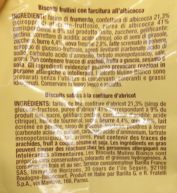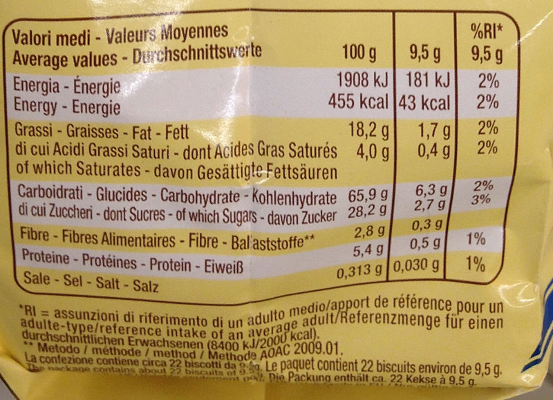 Barcode EAN:   8076809529976 Energy kcal/100g:   455 Satured Fat (per 100g)g:   4 Sugar into Carbohydrates (per 100g)g:   28.2 Proteines (per 100g)g:   5.4 Calcium CA/ mg (per 100g)g:   Gluten:   Production type:   Made in:   Italy Price €:   Bought here:   Last update:   2017-04-17 16:26:42 | Brand:   Fat (per 100g)g:   18.2 Carbohydrates (per 100g)g:   65.9 Fiber (per 100g)g:   2.8 Salt - Sodium (per 100g)g:   0.313 Ingredients (Indicative):   |