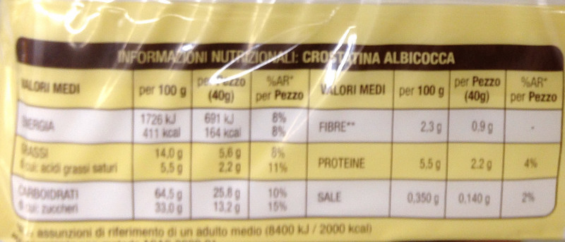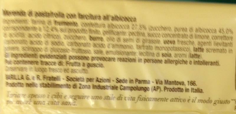 Barcode EAN:   8076809514859 Energy kcal/100g:   411 Satured Fat (per 100g)g:   5.5 Sugar into Carbohydrates (per 100g)g:   33 Proteines (per 100g)g:   5.5 Calcium CA/ mg (per 100g)g:   Gluten:   Production type:   Made in:   Italy Price €:   Bought here:   Last update:   2017-04-17 17:11:31 | Brand:   Fat (per 100g)g:   14 Carbohydrates (per 100g)g:   64.5 Fiber (per 100g)g:   2.3 Salt - Sodium (per 100g)g:   0.35 Ingredients (Indicative):   |