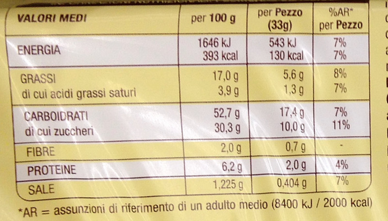 Barcode EAN:   8076809524322 Energy kcal/100g:   393 Satured Fat (per 100g)g:   3.9 Sugar into Carbohydrates (per 100g)g:   30.3 Proteines (per 100g)g:   6.2 Calcium CA/ mg (per 100g)g:   Gluten:   Production type:   Made in:   Italy Price €:   Bought here:   Last update:   2017-04-17 18:33:43 | Brand:   Fat (per 100g)g:   17 Carbohydrates (per 100g)g:   52.7 Fiber (per 100g)g:   2 Salt - Sodium (per 100g)g:   1.225 Ingredients (Indicative):   |