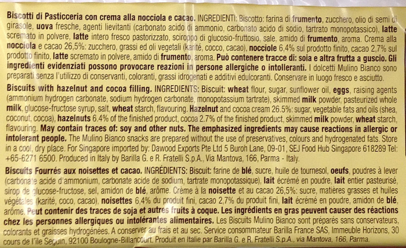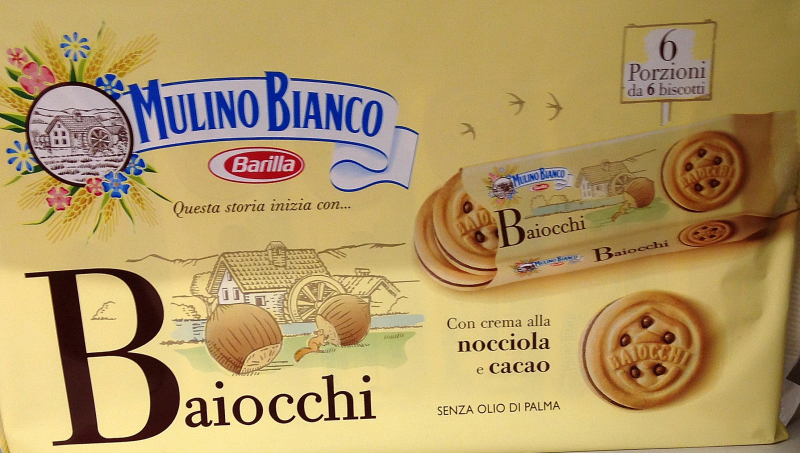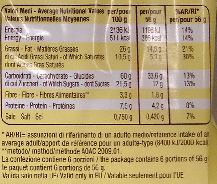 Barcode EAN:   8076809517706 Energy kcal/100g:   511 Satured Fat (per 100g)g:   10.5 Sugar into Carbohydrates (per 100g)g:   21.5 Proteines (per 100g)g:   7.5 Calcium CA/ mg (per 100g)g:   Gluten:   Production type:   Made in:   Italy Price €:   Bought here:   Last update:   2017-04-18 20:15:18 | Brand:   Fat (per 100g)g:   26 Carbohydrates (per 100g)g:   60 Fiber (per 100g)g:   3.3 Salt - Sodium (per 100g)g:   0.75 Ingredients (Indicative):   |