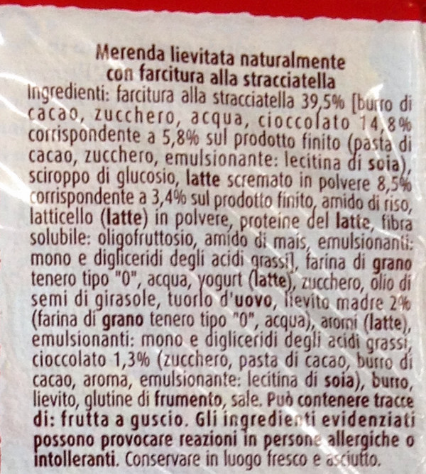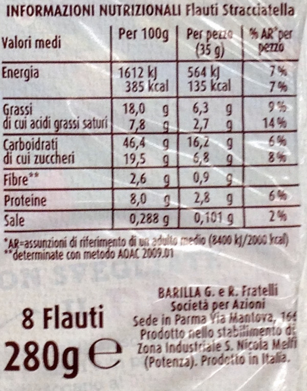 Barcode EAN:   8076809571517 Energy kcal/100g:   385 Satured Fat (per 100g)g:   7.8 Sugar into Carbohydrates (per 100g)g:   19.5 Proteines (per 100g)g:   8 Calcium CA/ mg (per 100g)g:   Gluten:   Production type:   Made in:   Italy Price €:   Bought here:   Last update:   2017-04-19 17:22:59 | Brand:   Fat (per 100g)g:   18 Carbohydrates (per 100g)g:   46.4 Fiber (per 100g)g:   2.6 Salt - Sodium (per 100g)g:   0.288 Ingredients (Indicative):   |
