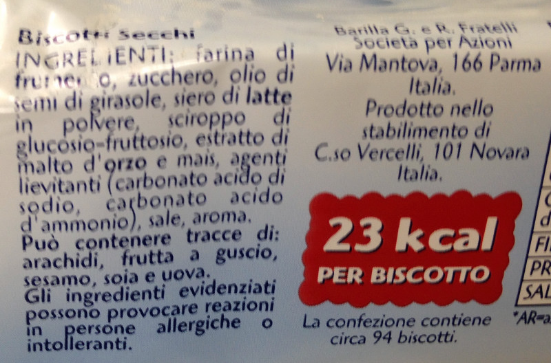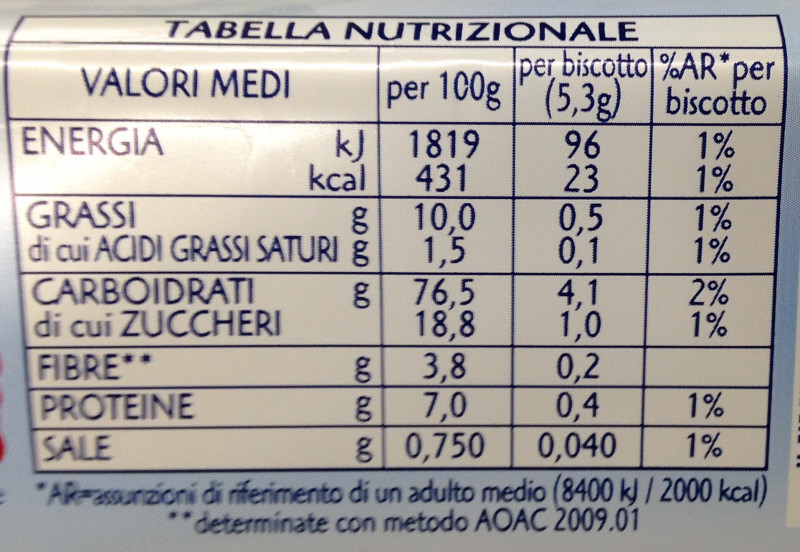 Barcode EAN:   8013355998429 Energy kcal/100g:   431 Satured Fat (per 100g)g:   1.5 Sugar into Carbohydrates (per 100g)g:   18.8 Proteines (per 100g)g:   7 Calcium CA/ mg (per 100g)g:   Gluten:   Production type:   Made in:   Italy Price €:   Bought here:   Last update:   2017-04-19 18:12:36 | Brand:   Fat (per 100g)g:   10 Carbohydrates (per 100g)g:   76.5 Fiber (per 100g)g:   3.8 Salt - Sodium (per 100g)g:   0.75 Ingredients (Indicative):   |