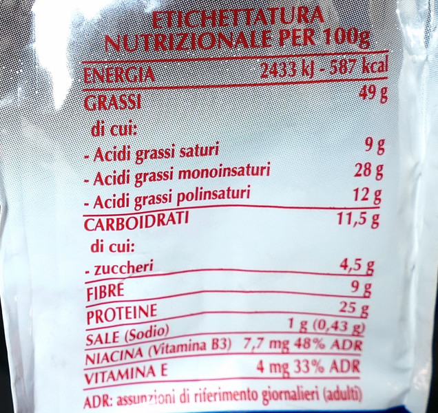 Barcode EAN:   8002290900758 Energy kcal/100g:   587 Satured Fat (per 100g)g:   9 Sugar into Carbohydrates (per 100g)g:   4.5 Proteines (per 100g)g:   25 Calcium CA/ mg (per 100g)g:   Gluten:   Production type:   Made in:   Price €:   Bought here:   Last update:   2017-05-01 16:40:39 | Brand:   Fat (per 100g)g:   49 Carbohydrates (per 100g)g:   11.5 Fiber (per 100g)g:   9 Salt - Sodium (per 100g)g:   1 Ingredients (Indicative):   |