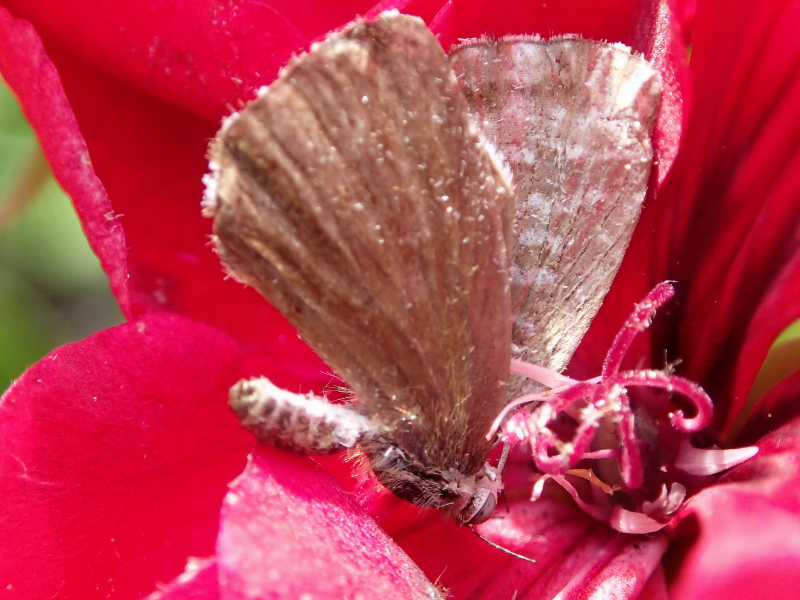 Cacyreus marshalli (Geranium Bronzei) which belongs to the family Lycaenidae, is a butterfly native to South Africa that recently arrived in Italy in the late 1980s (1). It is called "the plague of geraniums and pelargoniums" because of its ability to cause these and other flowers to die by laying eggs in the stems. In England it is called Geranium bronze. The color is in fact dark brown similar to bronze.