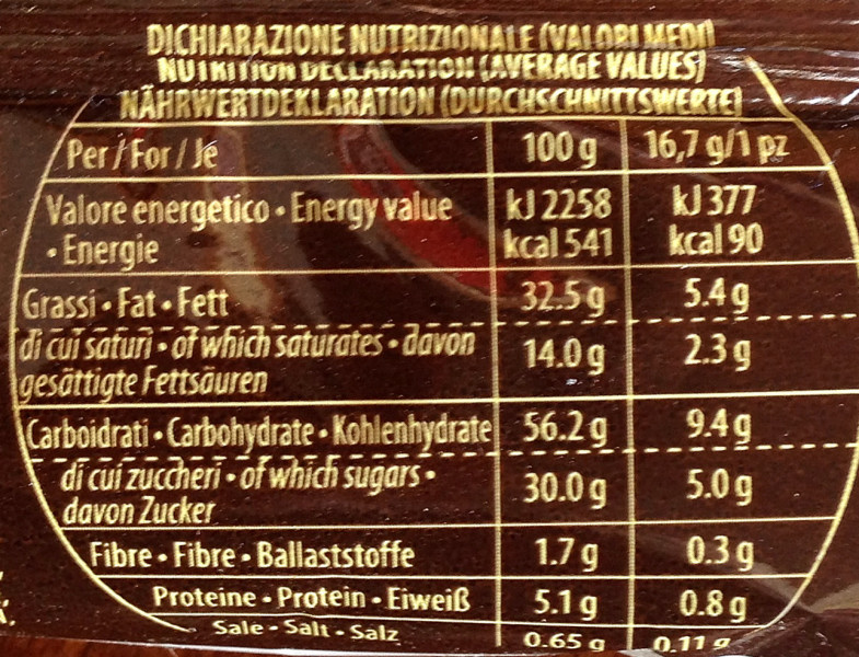 Barcode EAN:   8033102691489 Energy kcal/100g:   541 Satured Fat (per 100g)g:   14 Sugar into Carbohydrates (per 100g)g:   30 Proteines (per 100g)g:   5.1 Calcium CA/ mg (per 100g)g:   Gluten:   Production type:   Made in:   Italy Price €:   Bought here:   Last update:   2017-07-08 12:32:33 | Brand:   Fat (per 100g)g:   32.5 Carbohydrates (per 100g)g:   56.2 Fiber (per 100g)g:   1.7 Salt - Sodium (per 100g)g:   0.65 Ingredients (Indicative):   |