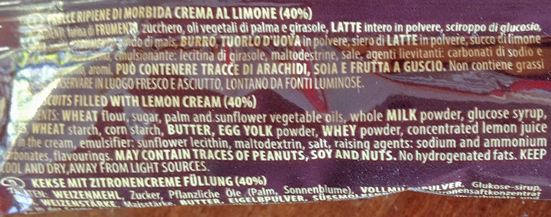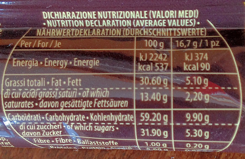 Barcode EAN:   8033102691427 Energy kcal/100g:   537 Satured Fat (per 100g)g:   13.4 Sugar into Carbohydrates (per 100g)g:   31.9 Proteines (per 100g)g:   Calcium CA/ mg (per 100g)g:   Gluten:   Production type:   Made in:   Italy Price €:   Bought here:   Last update:   2017-07-08 17:46:14 | Brand:   Fat (per 100g)g:   30.6 Carbohydrates (per 100g)g:   59.2 Fiber (per 100g)g:   1 Salt - Sodium (per 100g)g:   0.6 Ingredients (Indicative):   |