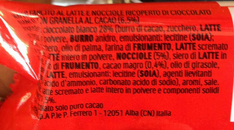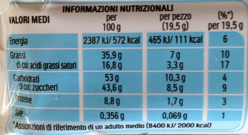 Barcode EAN:   0000080761761 Energy kcal/100g:   572 Satured Fat (per 100g)g:   16.8 Sugar into Carbohydrates (per 100g)g:   43.6 Proteines (per 100g)g:   8.8 Calcium CA/ mg (per 100g)g:   Gluten:   Production type:   Made in:   Italy Price €:   Bought here:   Last update:   2017-07-08 19:01:52 | Brand:   Fat (per 100g)g:   35.9 Carbohydrates (per 100g)g:   53 Fiber (per 100g)g:   Salt - Sodium (per 100g)g:   0.356 Ingredients (Indicative):   |