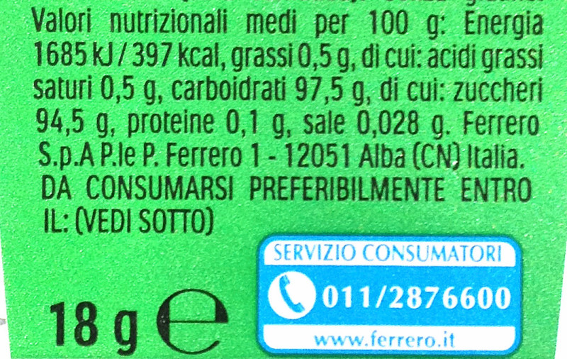 Barcode EAN:   80052043 Energy kcal/100g:   397 Satured Fat (per 100g)g:   0.5 Sugar into Carbohydrates (per 100g)g:   94.5 Proteines (per 100g)g:   0.1 Calcium CA/ mg (per 100g)g:   Gluten:   Production type:   Made in:   Italy Price €:   Bought here:   Last update:   2017-07-09 18:28:51 | Brand:   Fat (per 100g)g:   0.5 Carbohydrates (per 100g)g:   97.5 Fiber (per 100g)g:   Salt - Sodium (per 100g)g:   0.028 Ingredients (Indicative):   |