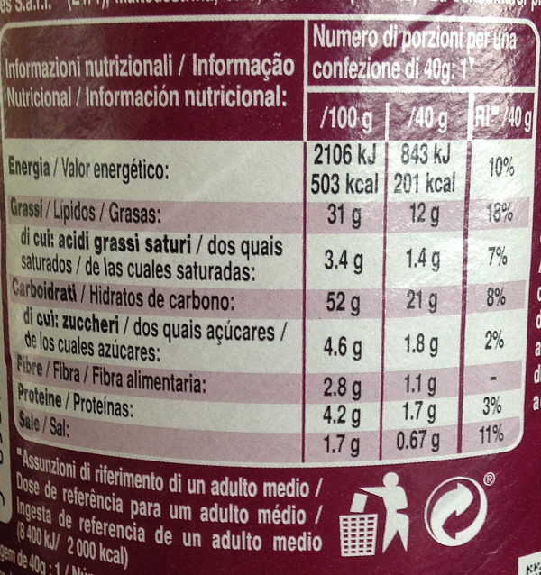Barcode EAN:   5053990107278 Energy kcal/100g:   503 Satured Fat (per 100g)g:   3.4 Sugar into Carbohydrates (per 100g)g:   4.6 Proteines (per 100g)g:   4.2 Calcium CA/ mg (per 100g)g:   Gluten:   Production type:   Made in:   United Kingdom Price €:   Bought here:   Last update:   2023-04-24 18:23:58 | Brand:   Fat (per 100g)g:   31 Carbohydrates (per 100g)g:   52 Fiber (per 100g)g:   2.8 Salt - Sodium (per 100g)g:   1.7 Ingredients (Indicative):   |