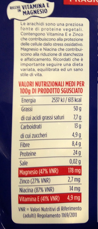 Barcode EAN:   8028618013597 Energy kcal/100g:   613 Satured Fat (per 100g)g:   7.7 Sugar into Carbohydrates (per 100g)g:   4.9 Proteines (per 100g)g:   24 Calcium CA/ mg (per 100g)g:   Gluten:   Made in:   Bought here:   Last update:   2019-12-30 18:39:59 | Brand:   Fat (per 100g)g:   50 Carbohydrates (per 100g)g:   13 Fiber (per 100g)g:   8.4 Salt - Sodium (per 100g)g:   0.02 Ingredients (Indicative):   Production type:   Price €:   |