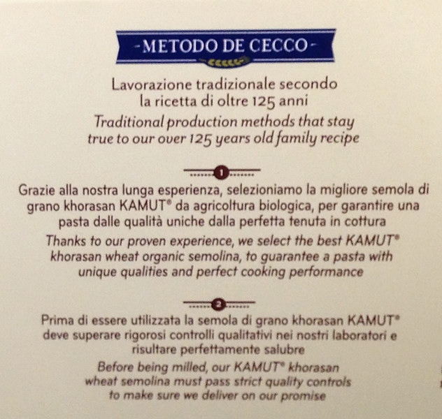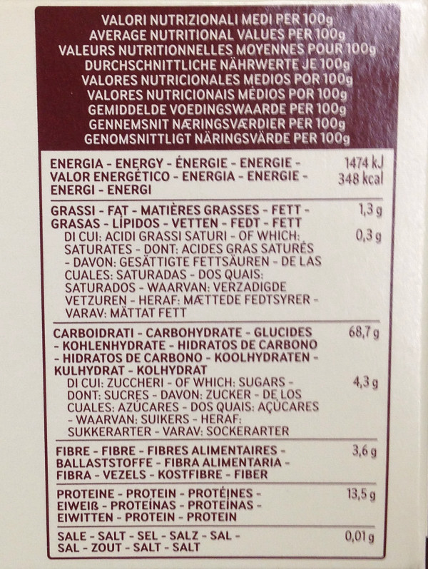 Barcode EAN:   8001250040121 Energy kcal/100g:   348 Satured Fat (per 100g)g:   0.3 Sugar into Carbohydrates (per 100g)g:   4.3 Proteines (per 100g)g:   13.5 Calcium CA/ mg (per 100g)g:   Gluten:   Made in:   Italy Bought here:   Last update:   2017-07-26 17:33:31 | Brand:   Fat (per 100g)g:   1.3 Carbohydrates (per 100g)g:   68.7 Fiber (per 100g)g:   3.6 Salt - Sodium (per 100g)g:   0.01 Ingredients (Indicative):   Production type:   Price €:   Cooking time - min.:   11 |