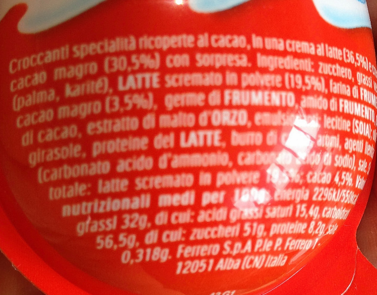 Barcode EAN:   80310891 Energy kcal/100g:   550 Satured Fat (per 100g)g:   15.4 Sugar into Carbohydrates (per 100g)g:   51 Proteines (per 100g)g:   8.2 Calcium CA/ mg (per 100g)g:   Gluten:   Production type:   Made in:   Italy Price €:   Bought here:   Last update:   2017-07-27 11:58:57 | Brand:   Fat (per 100g)g:   32 Carbohydrates (per 100g)g:   56.5 Fiber (per 100g)g:   Salt - Sodium (per 100g)g:   0.318 Ingredients (Indicative):   |