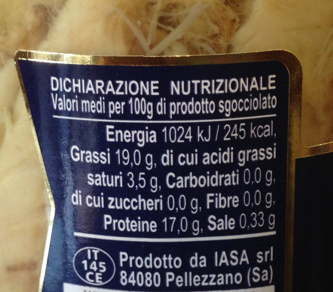 Barcode EAN:   80265764 Energy kcal/100g:   245 Satured Fat (per 100g)g:   3.5 Polyunsaturated Fat (per 100g)g:   Sugar into Carbohydrates (per 100g)g:   Salt - Sodium (per 100g)g:   0.33 From:   Indicative price €:   Last update:   2017-07-27 13:52:04 | Brand:   Fat (per 100g)g:   19 Monounsaturated Fat (per 100g)g (per 100g)g:   Carbohydrates (per 100g)g:   Proteines (per 100g)g:   17 Ingredients (Indicative):   |