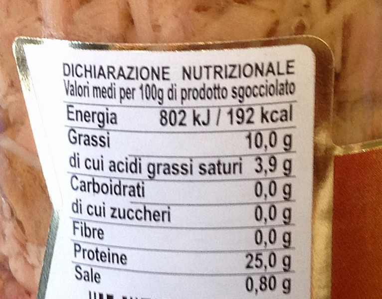 Barcode EAN:   80664499 Energy kcal/100g:   192 Satured Fat (per 100g)g:   3.9 Polyunsaturated Fat (per 100g)g:   0 Sugar into Carbohydrates (per 100g)g:   0 Salt - Sodium (per 100g)g:   0.8 From:   Indicative price €:   Last update:   2017-07-27 16:54:39 | Brand:   Fat (per 100g)g:   10 Monounsaturated Fat (per 100g)g (per 100g)g:   0 Carbohydrates (per 100g)g:   0 Proteines (per 100g)g:   25 Ingredients (Indicative):   |