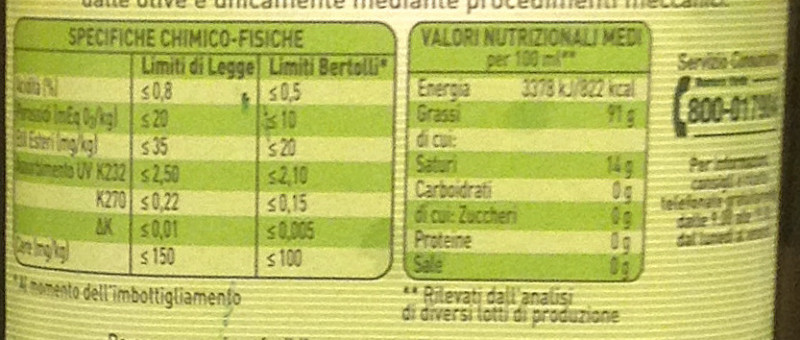 Barcode EAN:   8003900011048 Oil type:   Energy kcal/100ml:   822 Saturated fat g/100ml:   14 Polinsatured fat g/100ml:   Sugars into Carbohydrates g/100ml:   Sodium g/100ml:   Fiber g/100ml:   Price €:   Last update:   2017-08-09 21:14:04 | Brand:   Ingredients:   Fat g/100ml:   91 Monoinsatured fat g/100ml:   Carbohydrates g/100ml:   Proteines gr/100ml:   Cholesterol g/100ml:   Made in:   Italy Bought here:   |