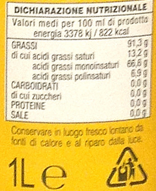 Barcode EAN:   8009113015200 Oil type:   Energy kcal/100ml:   822 Saturated fat g/100ml:   13.2 Polinsatured fat g/100ml:   6.9 Sugars into Carbohydrates g/100ml:   Sodium g/100ml:   Fiber g/100ml:   Price €:   Last update:   2017-08-11 19:18:58 | Brand:   Ingredients:   Fat g/100ml:   91.3 Monoinsatured fat g/100ml:   66.8 Carbohydrates g/100ml:   Proteines gr/100ml:   Cholesterol g/100ml:   Made in:   Italy Bought here:   |
