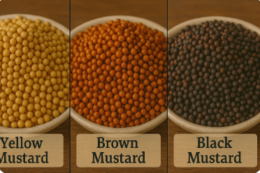 Sharp heat/pungency from AITC (more intense in brown/black; yellow is milder/sweeter).