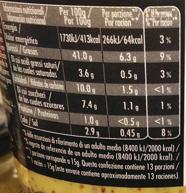 Barcode EAN:   3250541082912 Energy kcal/100g:   413 Satured Fat (per 100g)g:   3.6 Sugar into Carbohydrates (per 100g)g:   7.4 Proteines (per 100g)g:   1 Calcium CA/ mg (per 100g)g:   Gluten:   Production type:   Made in:   France Price €:   Bought here:   Last update:   2023-03-22 12:23:49 | Brand:   Fat (per 100g)g:   41 Carbohydrates (per 100g)g:   10 Fiber (per 100g)g:   Salt - Sodium (per 100g)g:   2.9 Ingredients (Indicative):   |