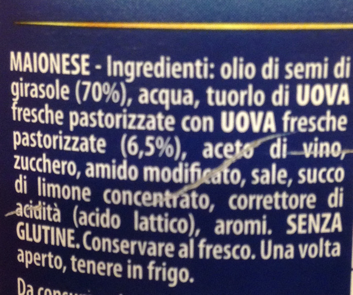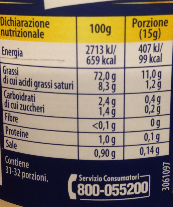 Barcode EAN:   8001590922101 Energy kcal/100g:   659 Satured Fat (per 100g)g:   8.3 Sugar into Carbohydrates (per 100g)g:   1.4 Proteines (per 100g)g:   1 Calcium CA/ mg (per 100g)g:   Gluten:   Production type:   Made in:   Italy Price €:   Bought here:   Last update:   2017-08-15 12:53:46 | Brand:   Fat (per 100g)g:   72 Carbohydrates (per 100g)g:   2.4 Fiber (per 100g)g:   0.09 Salt - Sodium (per 100g)g:   0.9 Ingredients (Indicative):   |